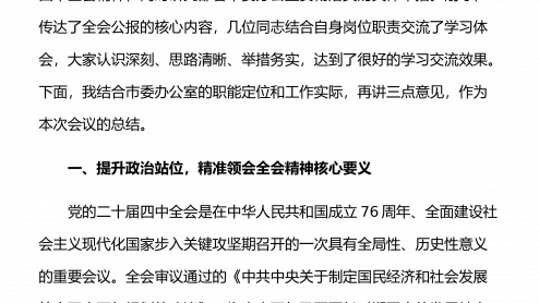 在市委办公室传达学习党的全会精神专题会议上的总结讲话